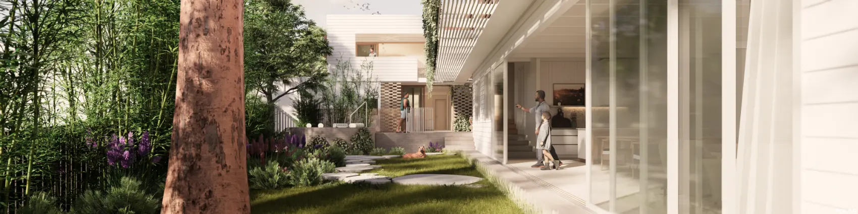 Rather than demolish the existing house on the site, we proposed to retain it & renovate the interior & extend to the rear, which assisted in keeping budget on track. A courtyard style home designed around a significant gum tree will sit beyond the existing renovated house & include a pool, fire pit / chimney.