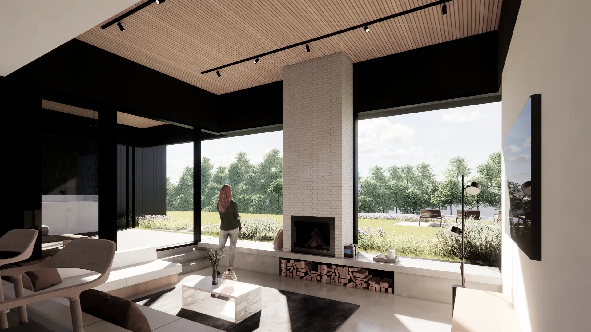Internally, a sunken lounge alludes to sitting within the terrain, framed by panoramic views out to the landscape. The white brick fireplace acts as the connecting bridge between ground and sky - a landmark on the hill.