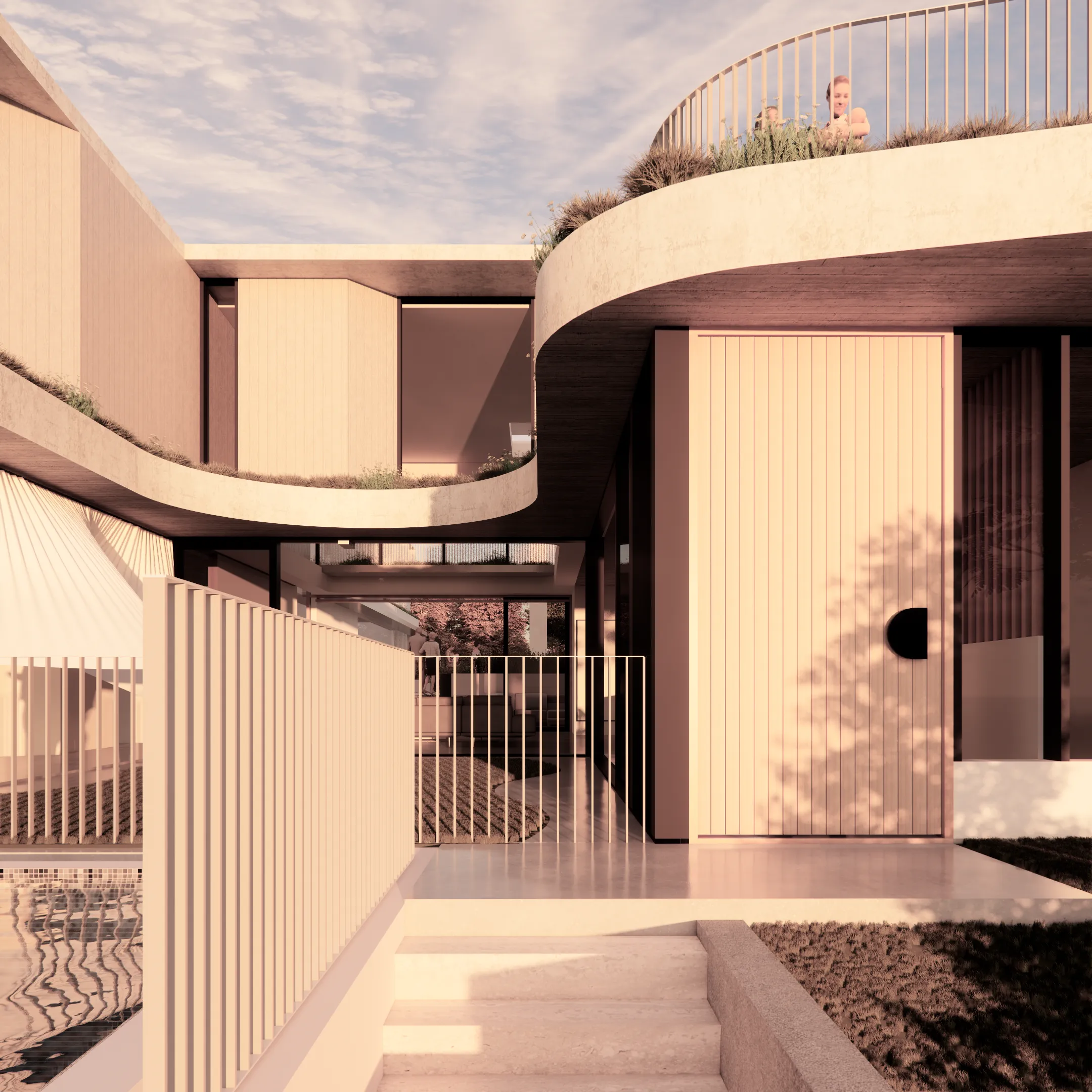 Celebrating subtropical living, the design facilitates a calm retreat for family & natural connections. The sweeping curved concrete planters create a bold street presence & wrap the courtyard space to celebrate outdoor living spaces in the subtropical climate of Queensland.