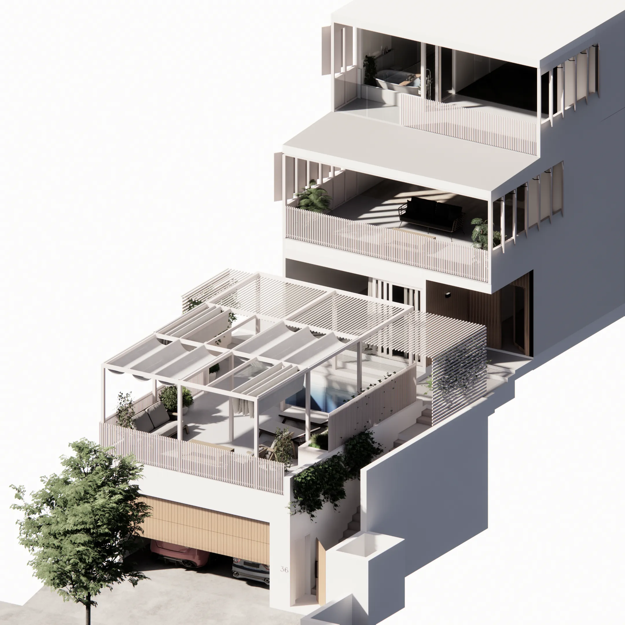 A moveable shade canopy structure defines the terrace, operable in response to elements. From the street, the structure offers a constantly shifting façade, providing visual interest & celebrating outdoor living.