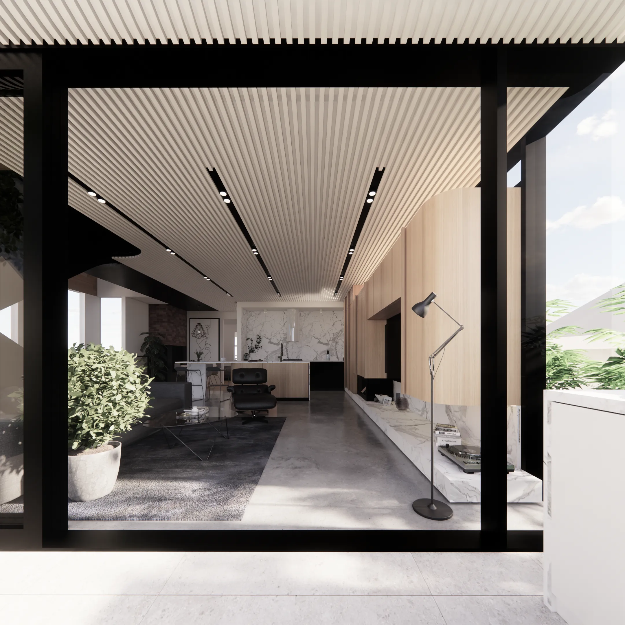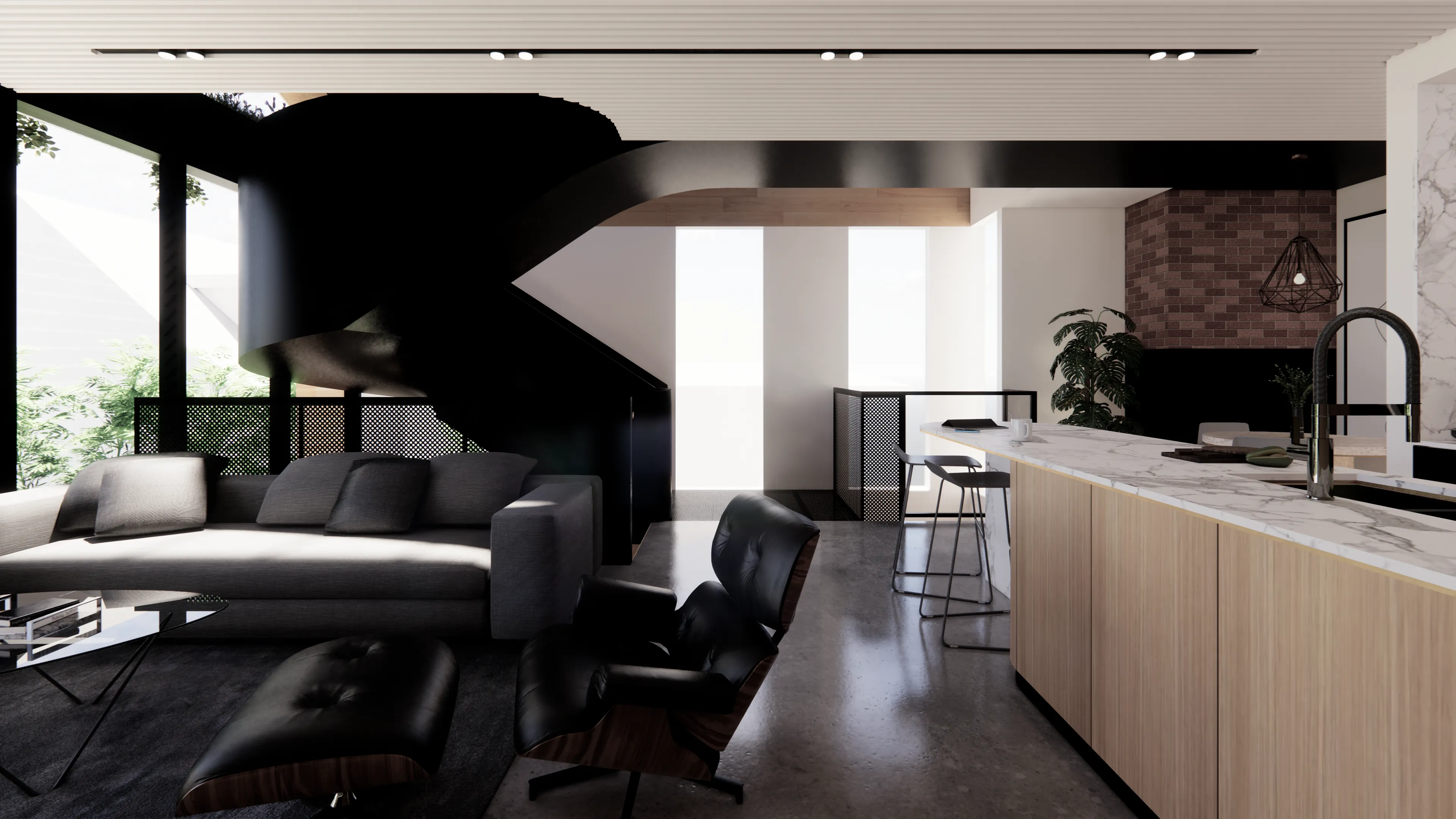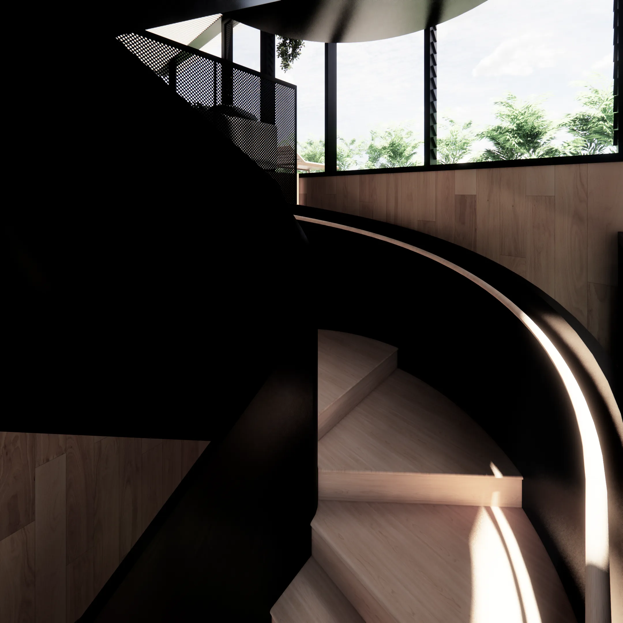 The entry frames a clear view of the sculptural stair, linking all four levels of the house. The living, dining, & kitchen are all elevated to take advantage of the city aspect, where automated louvres and operable openings enhance cross-ventilation and support subtropical living.