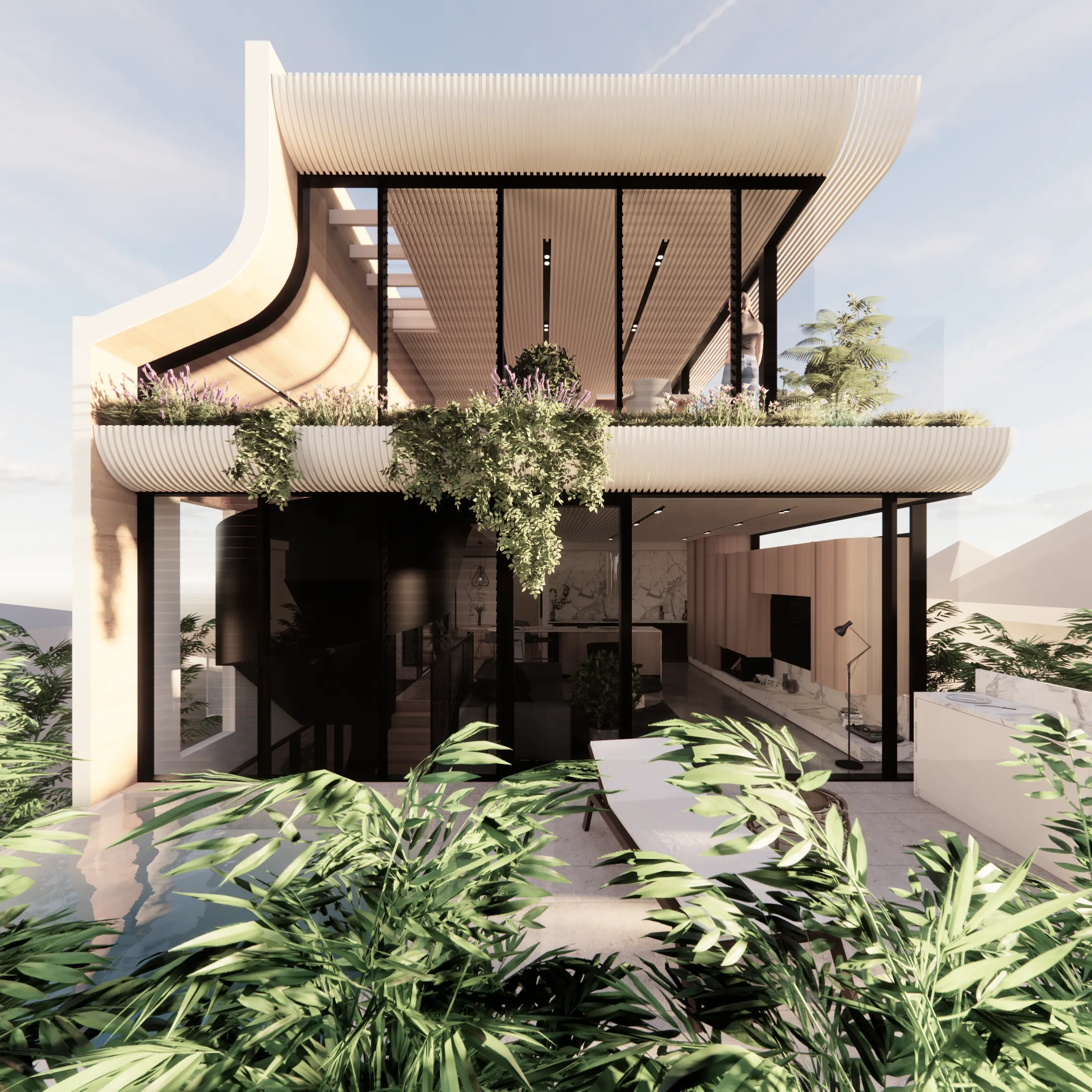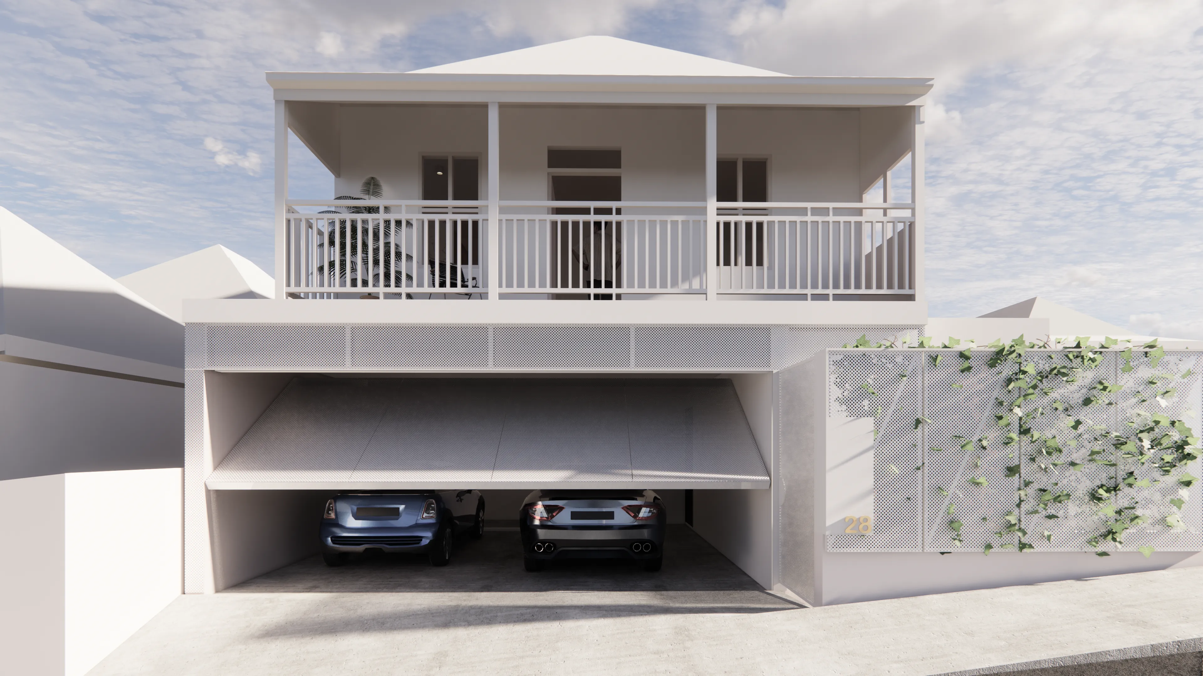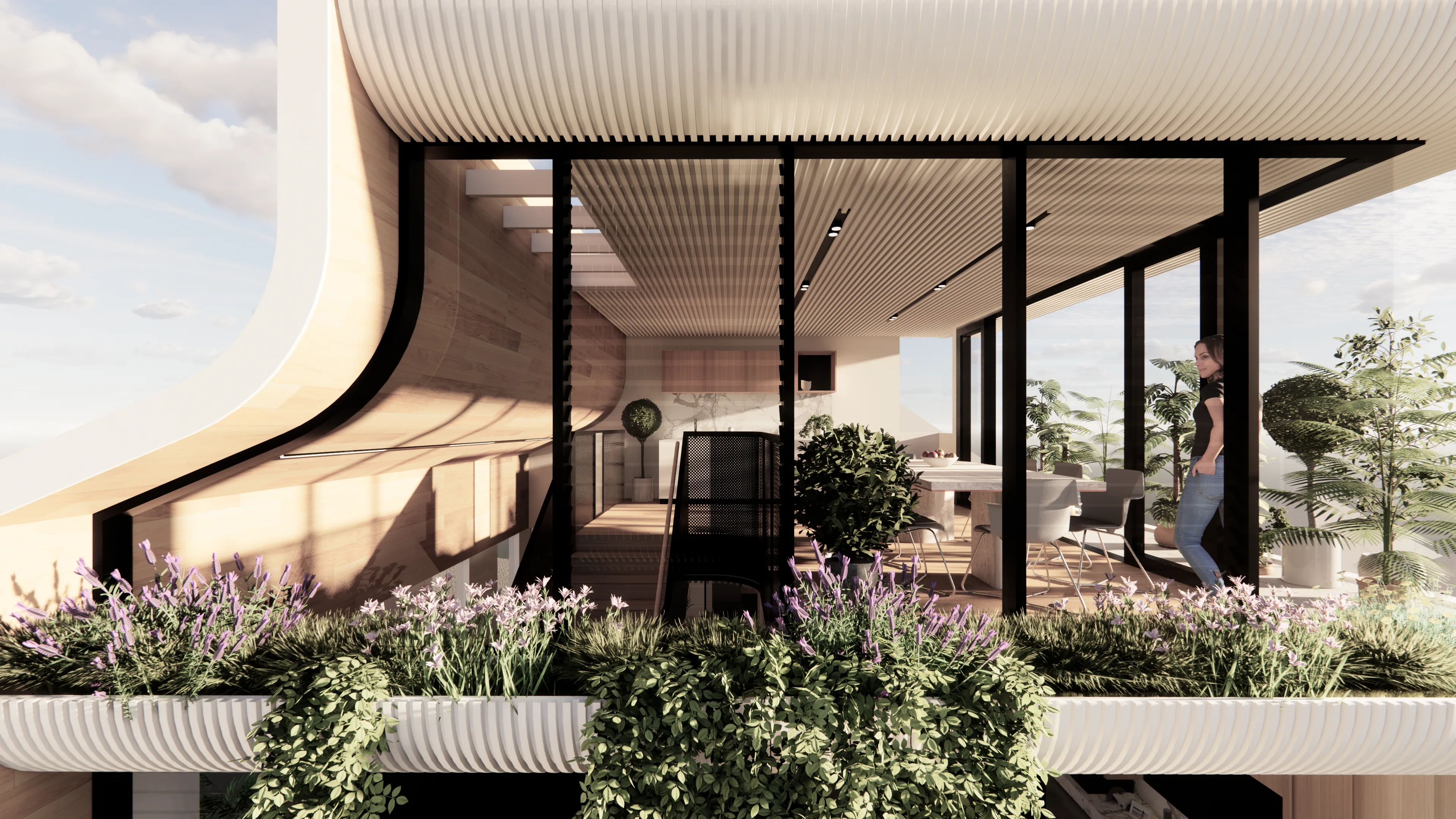 The entry frames a clear view of the sculptural stair, linking all four levels of the house. The living, dining, & kitchen are all elevated to take advantage of the city aspect, where automated louvres and operable openings enhance cross-ventilation and support subtropical living.