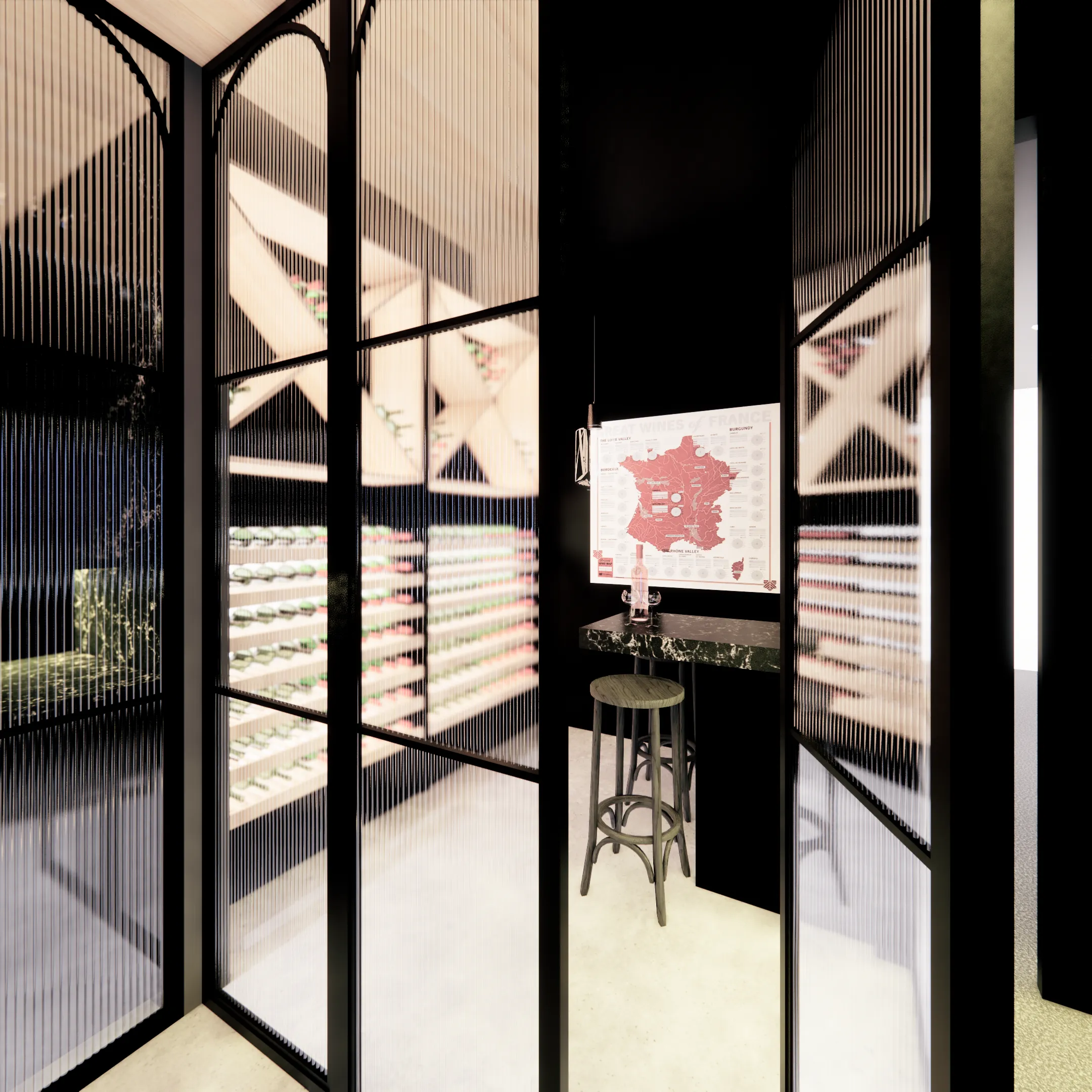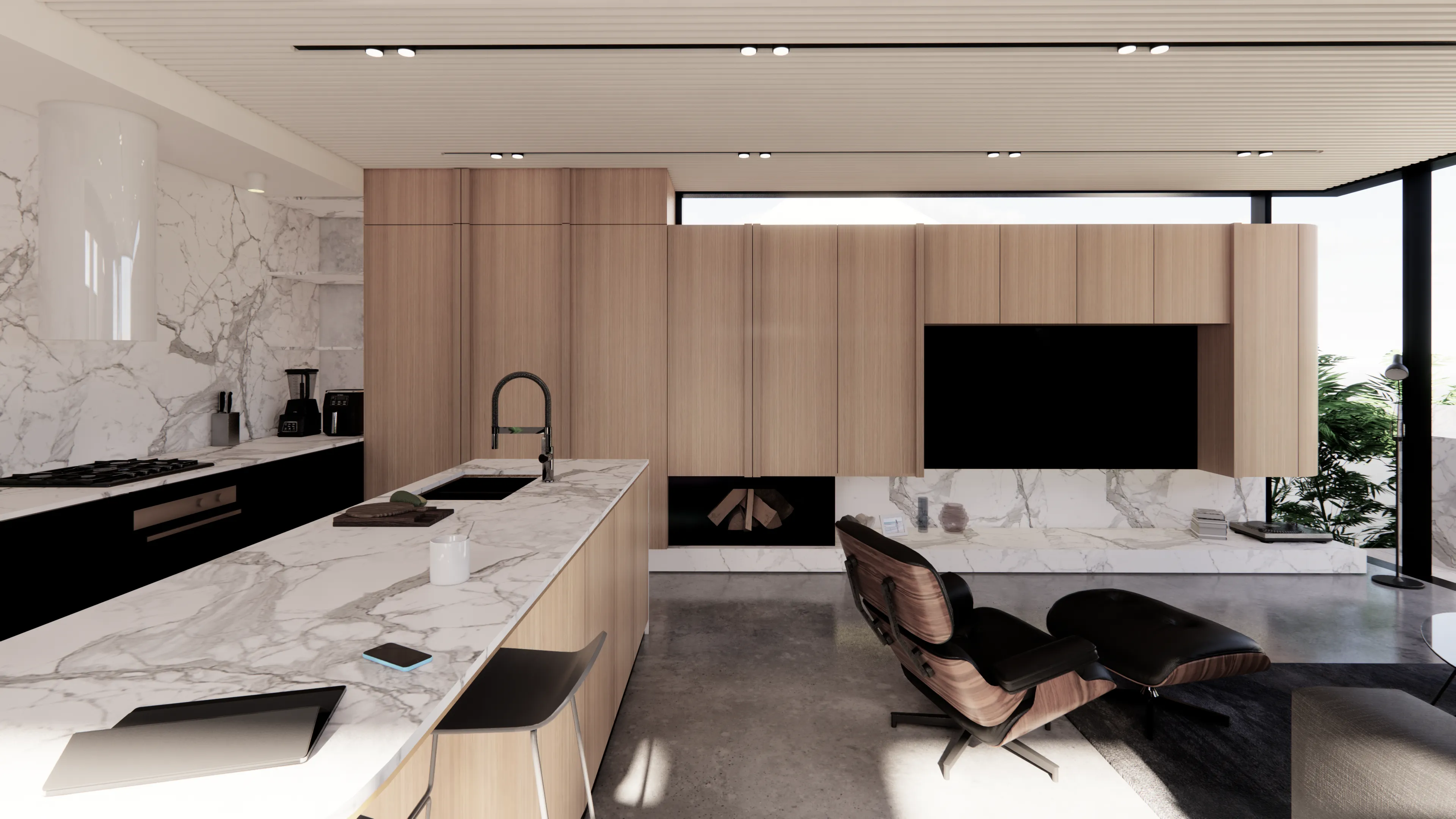 While the top level provides a light-filled & open flexible space, the subterranean media, bar & cellar are designed for luxurious home entertainment, continuing the material narrative that unites the multi-level home.